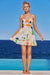 Forever femme in a babydoll-inspired mini dress, this stunning mini features ruching detailing at bust, adjustable tie back, and flowy skirt for an added special touch.