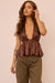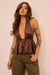 Shine effortlessly in this foiled chiffon halter top. Designed with a daring deep plunge neckline and a gathered peplum hem, it balances allure with playful movement. The shimmering chiffon catches the light with every step, while the open back with tie detail adds an extra touch of drama. Perfect for nights out, rooftop drinks, or anywhere you want to make an entrance.