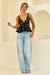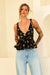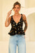 Bask in the glow of effortless elegance with the Moonbeam Luxe Sequin Chiffon Top. Crafted from a sheer embroidered fabric adorned with glimmering sequins, this piece captures the light with every move. Featuring a deep V neckline, adjustable tie straps, and a flattering peplum hem, it strikes the perfect balance between romantic charm and modern allure. Pair it with denim for a laid-back sparkle or dress it up with a floaty skirt for an evening out.