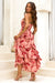Romance blooms in this enchanting strapless gown, crafted in soft chiffon and scattered with painterly rose motifs. Featuring a flattering fitted bodice and cascading tiered layers, it moves beautifully with every step, creating a dreamy silhouette. Perfect for garden parties, sunset weddings, or any occasion where elegance meets ease, this piece captures the essence of timeless femininity with a modern allure.